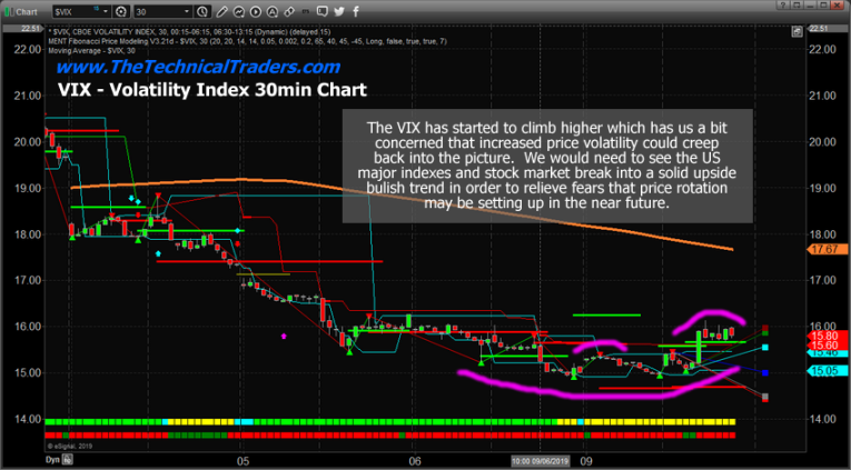 The VIX, on the other hand, is still showing us that price volatility has not vanished quite yet.  The VIX started moving higher early in trading and continues to push a bit higher right now.  If the VIX moves back above 18 or 19 quickly, the we are likely going to see increased volatility in certain sectors of the market which could present real problems for traders.  As long as the VIX stays below 18, then the volatility may stay a bit muted going forward.
