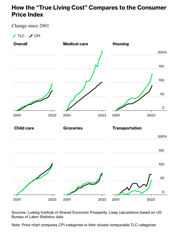 Ludwig and his team came up with an alternative measure called the True Living Cost (TLC). The metric only includes minimal household needs such as housing, transportation, food, medical care, childcare, along with necessary items as cell phones, clothing, and items for personal hygiene.