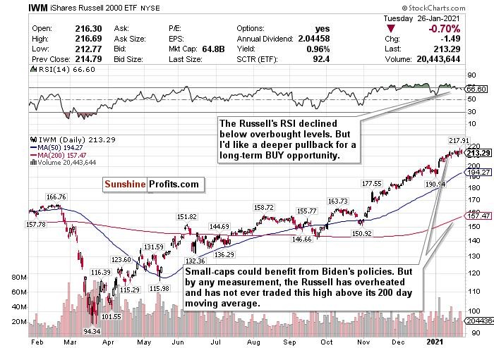 After the RSI hit another overbought level of approximately 77 two Wednesdays ago (January 13), the IWM declined by another 1.5%. I said that Russell stocks would imminently cool down because the RSI was too hot, and precisely that’s what happened.