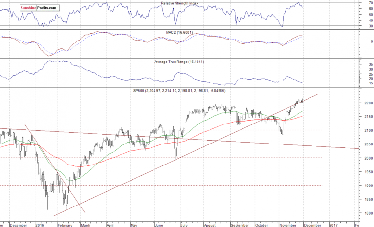 Concluding, the broad stock market retraced some of its recent advance yesterday, as the S&P 500 index broke slightly below 2,200 mark. We still can see technical overbought conditions. Therefore, we continue to maintain our speculative short position (opened on November 16 at 2,177 - opening price of the S&P 500 index). Stop-loss level is at 2,240 and potential profit target is at 2,060 (S&P 500 index). You can trade S&P 500 index using futures contracts (S&P 500 futures contract - SP, E-mini S&P 500 futures contract - ES) or an ETF like the SPDR S&P 500 ETF - SPY. It is always important to set some exit price level in case some events cause the price to move in the unlikely direction. Having safety measures in place helps limit potential losses while letting the gains grow.
