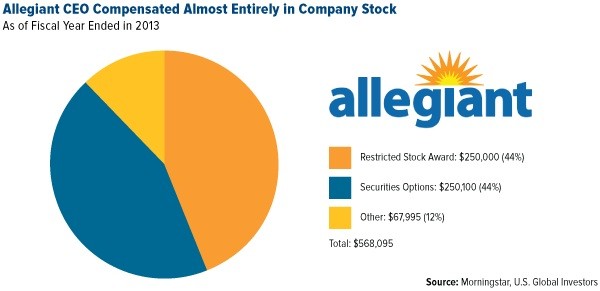 Fellow airline executive Maurice J. Gallagher Jr. of Allegiant Air has also passed on cash, receiving a little over half a million dollars in stock and options in 2013 alone.