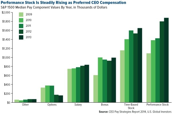 Stock has been steadily growing in importance as a form of compensation for the most successful CEOs. Between 2009 and 2013, performance stock for those leading S&P 1500 Index companies rose 52 percent, the largest increase of any other type of payment. Compared to all other methods, in fact, performance stock is now the most-preferred, according to executive compensation consultancy firm Equilar.