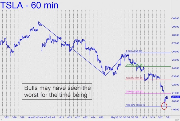 Is it okay for Tesla bulls to come out of their bomb shelters?  Perhaps, but only with caution. The stock bounced sharply on Monday from a low that was close to the 193.31 Hidden Pivot support we were using as a minimum downside target.