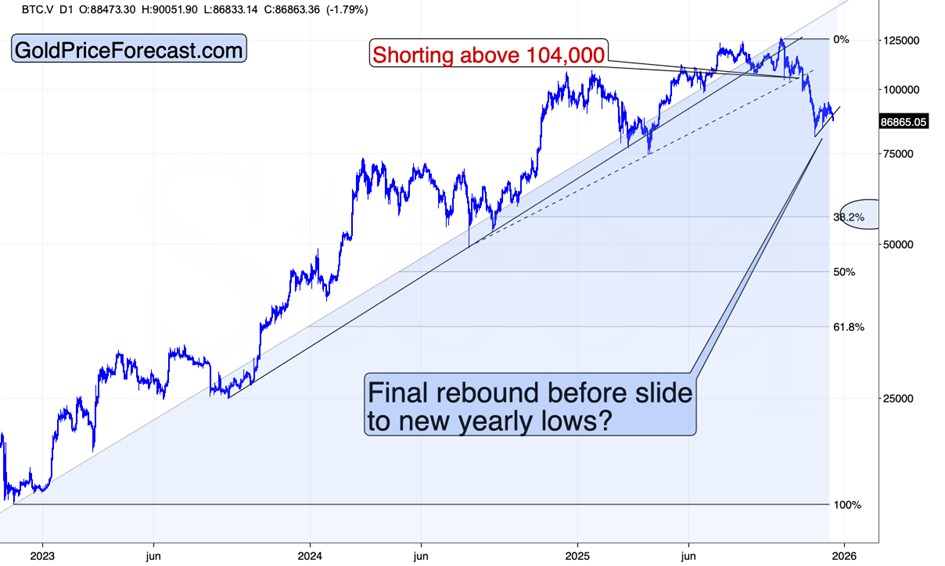 The move that preceded the flag was a decline from above $120k to almost $80k. If bitcoin declines by over 35% again, it can slide all the way down to $60k – in perfect tune with my previous target area.