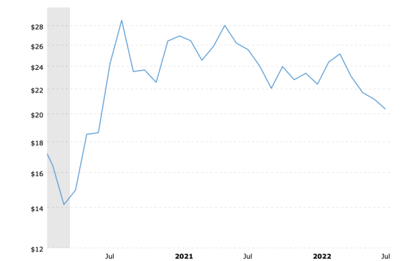 An extended, downward slide has taken the silver price down by thirty percent since its peak of close to $30 oz. in August 2020. At its recent low of $18.40, silver’s price has declined by thirty-seven percent over the past two years.