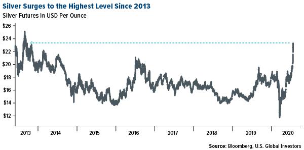 The best performing precious metal for the week was silver, up 17.79 percent. Silver had its biggest weekly gain in nearly 40 years and could keep soaring. The metal hit its highest level since 2013. Mike McGlone, commodity strategist at Bloomberg Intelligence says the white metal could eventually climb to $30 an ounce amid a broad-based bull market for precious metals. McGlone predicts the metal will stay between $20 and $25 for an extended period before moving higher. The Global X Silver Miners ETF had a ninth straight day of inflows and the iShares Silver Trust saw five consecutive days of money flows.