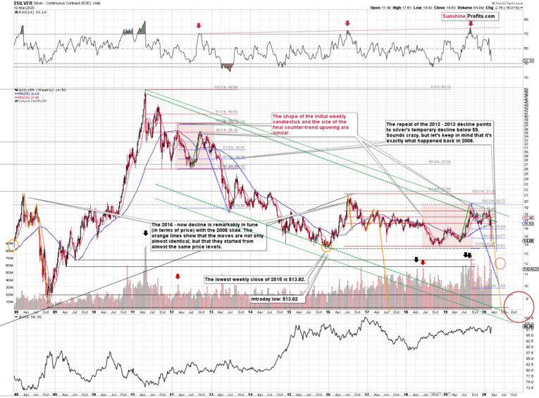It also means that silver is very likely to decline AT LEAST to $9. At this point we can’t rule out a scenario in which silver drops even to its all-time lows around $4-$5.