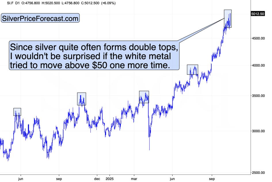 Given the momentum and the breakout that we just saw (to new all-time highs), and knowing silver’s tendency to form fake-breakouts, it wouldn’t be surprising to see silver top at about $51 - $52 before surprising almost everyone and sliding.