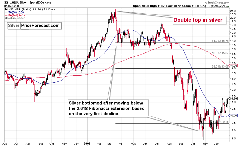 Silver’s 2008 top was also a double top. The second high was slightly above the first one.
