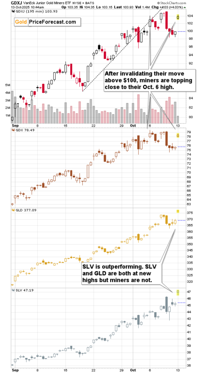 Gold, silver, and miners are up, but while gold and silver are up to new highs, mining stocks are not – they are only testing their Oct. 6 high – nothing more.