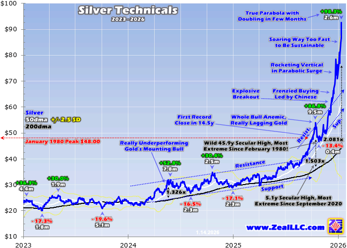Silver’s daily gains in these last few weeks have been crazy, including massive up days of 9.2%, 5.6%, 5.5%, 6.3%, 6.4%, and 6.9%!  In the 31 trading days since December dawned, silver has surged or soared to new all-time-record highs on fully 16 of them!  And silver’s overboughtness is far-beyond-extreme, unlike anything seen in most investors’ lifetimes.  That prompted me to write this essay, which I will be attacked for.