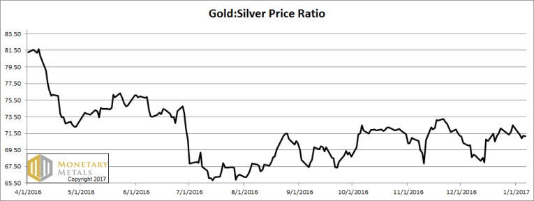 Next, this is a graph of the gold price measured in silver, otherwise known as the gold to silver ratio. It fell a bit this week.