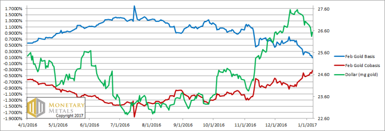 We now have several weeks of data to see a distinct pattern. Since Dec 15, the dollar has been falling (which muggles perceive as gold rising, much the way people in a sinking ship see a lighthouse rising). What’s new is that gold has been getting more scarce while this happens. The red line (i.e. the cobasis, our measure of scarcity) is rising while the green line (i.e. the dollar price in gold milligrams) is falling. This is no mere repositioning by speculators. It’s fundamental demand.