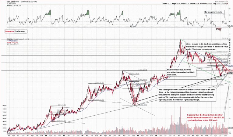 (…) the support line based on the 2008 and 2013 lows creates an initial downside target – something that silver is likely to reach (and pause / bounce) before moving to our final target level around the $16 level. At this time, this initial target is very close to $19.50.