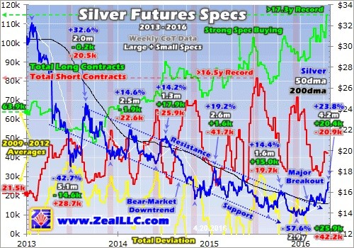 Rather ironically, speculators also added longs on balance as silver ground lower on balance in its bear-market downtrend between 2013 and 2015. There were plenty of speculators who realized silver was an incredible fundamental bargain. But they could never muster enough concurrent buying to break silver free of its downtrend’s resistance, which would’ve started attracting in more capital from other traders.