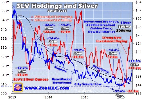So SLV is a great proxy for overall silver demand available at a daily resolution, vastly superior to the delayed annual resolution of the Silver Institute’s comprehensive data. This next chart looks at these same silver rallies over the past few years superimposed over SLV’s holdings. Just as speculators are behaving very differently in 2016, so are investors. They are flocking back to silver again for the first time in years!
