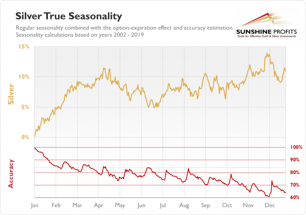 Let’s take a look at the first chart. It is our proprietary Silver True Seasonality where we combined the regular seasonality with the effect of the expiration of options and accuracy estimation. The yearly seasonal pattern of the price of silver was calculated using a 17-year-long period from 2002 to 2018 and then adjusted for the expiration of options that we observed between 2009 and 2018.