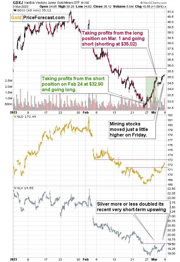 Namely, while the GDXJ (upper part of the chart) moved only a little above its recent high, silver has pretty much doubled its previous short-term upswing.