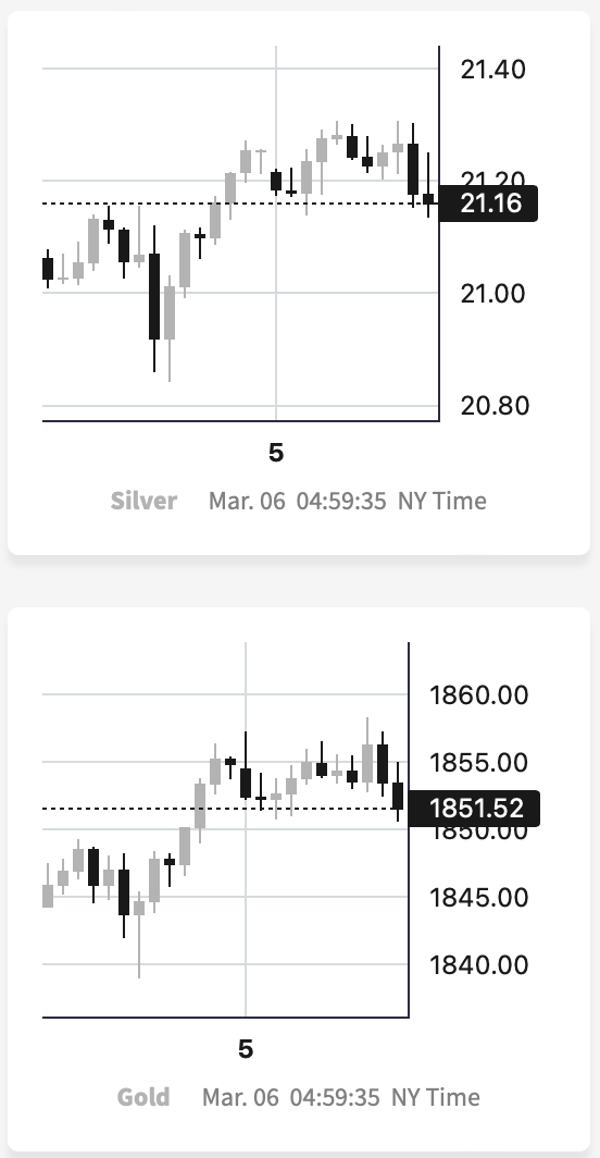 So far, gold and silver are both down in today’s pre-market trading (chart courtesy of https://www.SilverPriceForecast.com/).