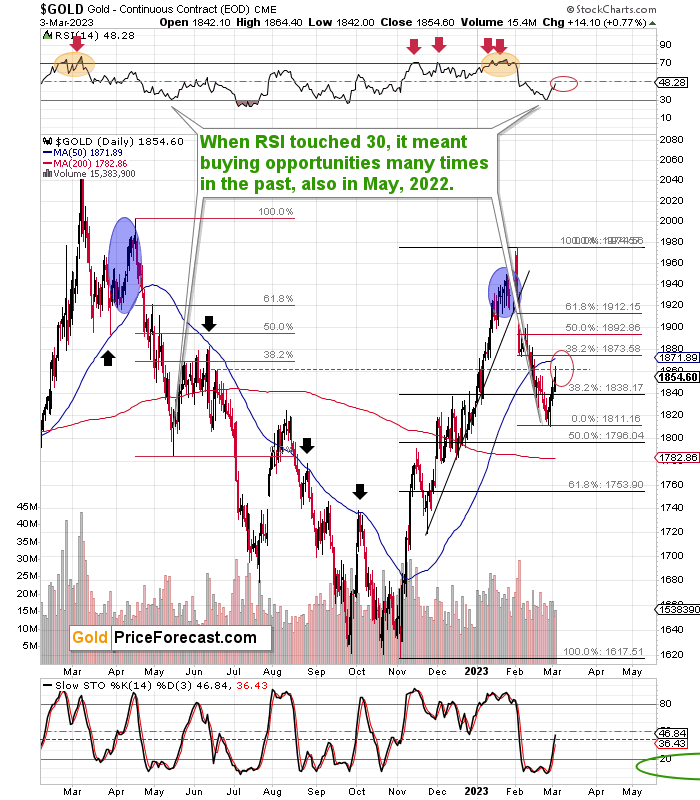 Forecasting gold prices in the short run is not an easy task right now, as gold moved to one of its resistance levels (the mid-June 2022 high), but didn’t move to the combination of particularly strong short-term resistance levels yet. It doesn’t need to reach the latter, as the strong medium-term outlook remains to the downside and the RSI indicator has already moved to the middle of its trading range, thus doing what, back in mid-2022, meant that the key part of the rally was over.