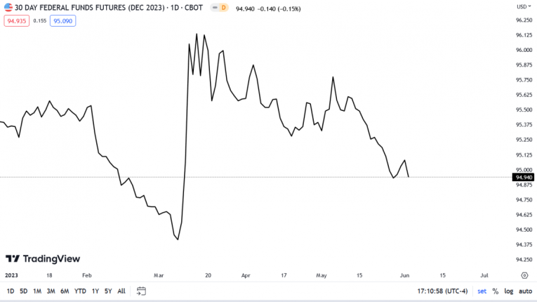 To explain, the black line above tracks the December Fed Funds Futures contract. And since the yield moves inversely to the price, the black line’s decent highlights how bank run fears have abated and economic reality is in style once again.