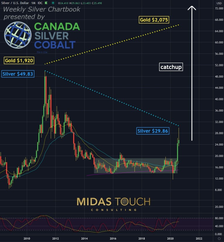 Yes, it looks like Silver has caught up. After all, a move from US$11.64 to US$29.86 is quite a feat for what was previously a multiyear sideways range from US$14 to US$19. But consider the following. When in 2011 Gold had its high at US$1,920, Silver’s high was US$49.83. Now Gold traded as high as US$2,075, while Silver only reached US$29.86. As Silver historically follows Gold and the Gold/Silver-Ratio being near 75 with a potential to go much lower indicates there being plenty of room for Silver needing to catch up much further. Silver – A lifetime opportunity – Now!
