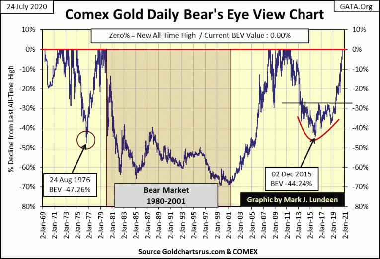 This week all the excitement was in the old monetary metals, so for a change let’s start with gold which closed the week at a new all-time high of $1900.88, or a 0.00% in the BEV Chart below. Gold hasn’t seen a new BEV Zero since August 2011, almost nine years ago.