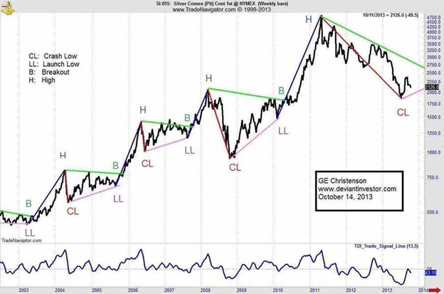 Since the bottom in November 2001 at a weekly close of $4.03, silver has had four launch lows, breakouts, highs, and crash lows. We await the next launch low, subsequent breakout and a new high in the 5th cycle. Based on the chart, the high in April 2011 was quite high, the subsequent low in July 2013 was an unusually deep correction and substantially delayed compared to previous cycles. I interpret this extended and deep low as a reaction to the huge rally from about $18 in mid-2010 to nearly $50 in April 2011. High Frequency Trading and massive intervention since the crash of 2008 have pushed the prices for gold and silver much higher and much lower than in previous cycles. They have also made the timing projections less reliable, but certain parallels are clear. The last four cycles from crash low to high have taken from 1.75 to 2.5 years. That suggests an upcoming high sometime in 2015 – 2016. The last four cycles from crash low to launch low have taken 1.0 to 1.3 years. That suggests an upcoming launch low sometime in 2014. Following the launch lows, highs occurred approximately 0.5 to 1.2 years later. That suggests a high sometime in 2015 or 2016. We will wait and see. But what if the market has fundamentally changed and the April 2011 high near $50 was a long term top that might not be repeated for another decade or so? I doubt it, but reputable forecasters such as Harry Dent believe that gold will drop to about $750 during the long term commodity bear market that he sees this decade. To address the possibility, consider this table: