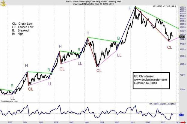 During the past 12 years silver prices have bottomed, rallied sharply, collapsed, and then languished for a year or more. The patterns are not identical, but there are obvious similarities as shown in the following chart. (Note that it is a weekly line chart, from close to close, log scale, with high and low bars not shown. For example, silver might have bottomed on a Wednesday but only the Friday close is plotted.)