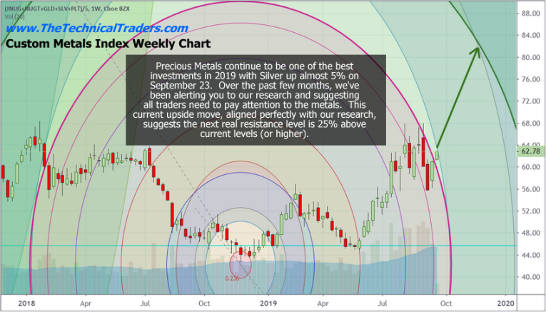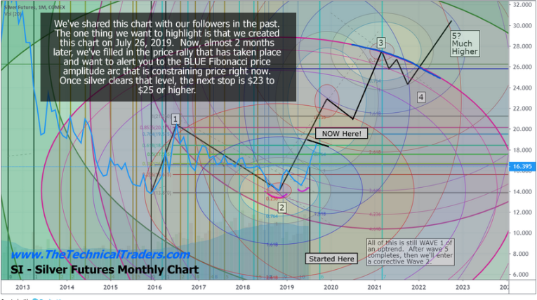 This next Silver Weekly chart was shared with our members near July 25, 2019. Pay very close attention to the arrows we drew on the chart at that time. Guess what the price of Silver actually did after this chart was shared with our readers? Yup, Silver shot up to $19.75 in early September, rotated back to the $17.50 level near the middle of September, and is starting a new rally towards the $23 to $25+ level right now. Does that look familiar to you on this chart (below)?