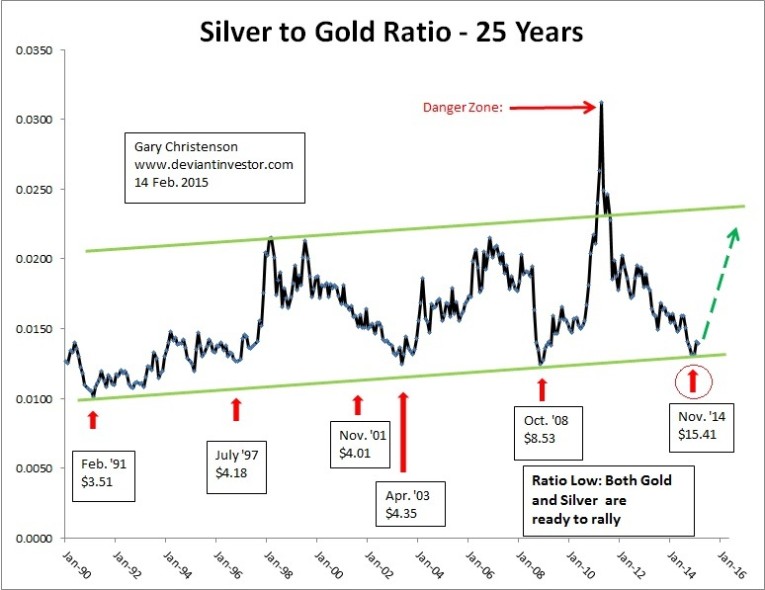 - The major lows in silver prices during the past 25 years are marked with red arrows on the graph. They coincide, more or less, with lows in the silver to gold ratio.