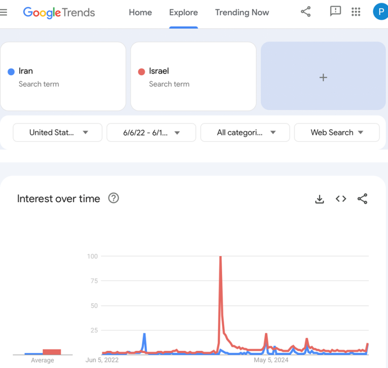 The thin lines represent cases when Iran was searched for, and the thick lines represent cases when both: Iran and Israel were searched for.