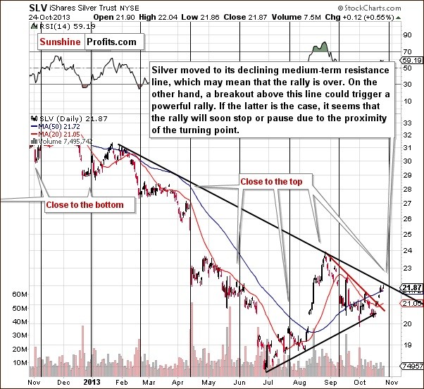 Looking at the above chart we see that the SLV ETF moved above the 50-day moving average and reached the medium-term declining resistance line (based on daily closing prices - February and August highs) in the previous week.