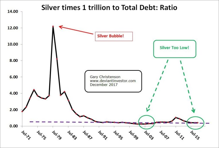 Graph the price of silver (times a trillion) divided by the national debt. The ratio is low because debt has increased rapidly and silver is inexpensive.