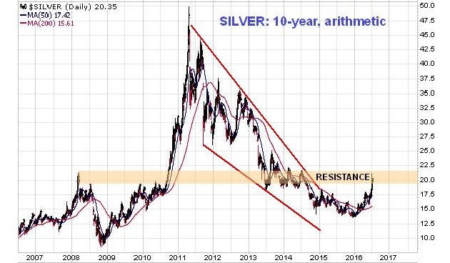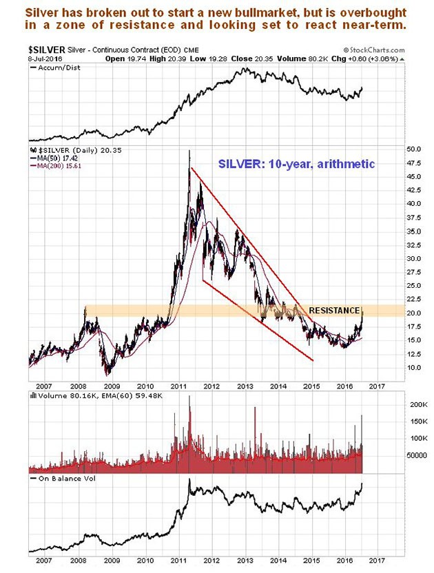 The long-term 10-year arithmetic chart gives us a much broader perspective. This is actually a very positive chart overall, for as we can see silver's bear market phase from 2011 has definitely ended. However, it has risen quite sharply in recent months to arrive at a zone of significant resistance, so it would be quite normal for it to consolidate or react back here, before breaking above this resistance and continuing higher.