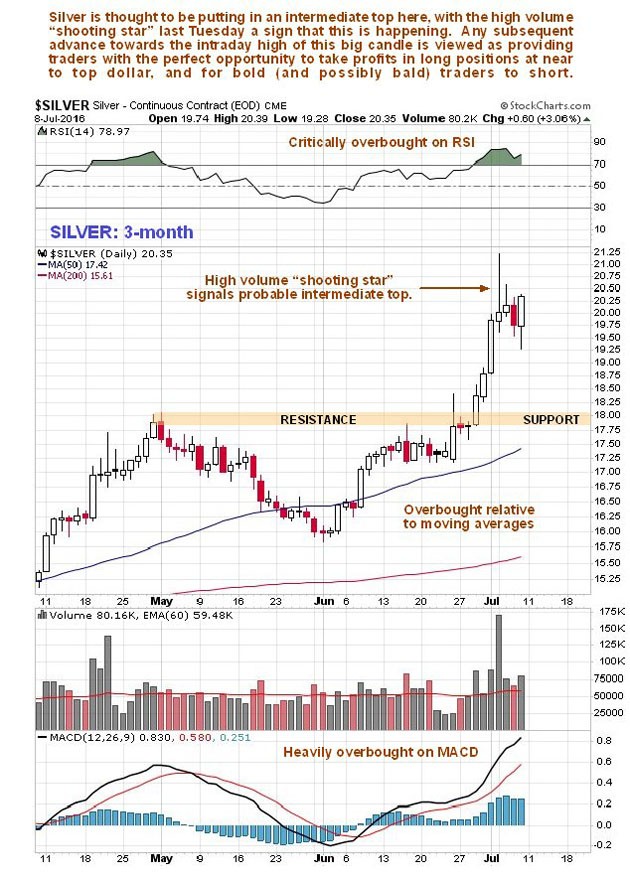 On its short-term 3-month chart (below), we can see that, after rising sharply late last month, a sizeable bearish "shooting star" appeared on the chart on heavy turnover at the start of this month, at a time when silver was critically overbought, which indicates a high probability that silver will react back soon.