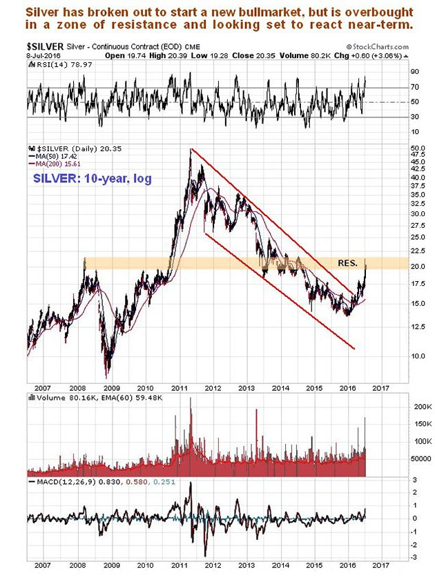 The long-term outlook for silver is very positive indeed, but over the short to medium-term it looks set to react.