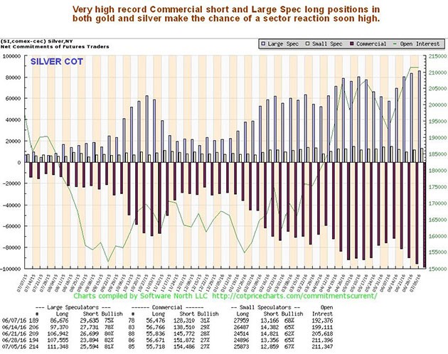 As with gold, Commercial short and Large Spec long positions in silver have built up to a very high record level, making a reaction back soon a high probability. . .