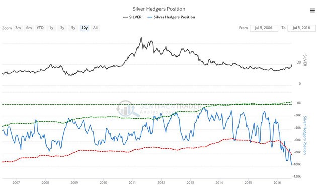 The COT chart shown above, which only goes back a year, probably doesn't drive home just how extreme the current situation is. If not, then the following chart should get the job done. The long-term Hedgers chart shown below, which is a form of COT chart, shows that Hedgers positions are now at frightening bearish extremes. When the reading reaches the red dotted line it is at a normal bearish extreme, which often, but not always, leads to a drop in the silver price. When the reading is way below it, as now to an unprecedented extent, the situation is critical, and please note that I didn't create this chart, sentimentrader did, and they are not known for being anything other than totally objective.