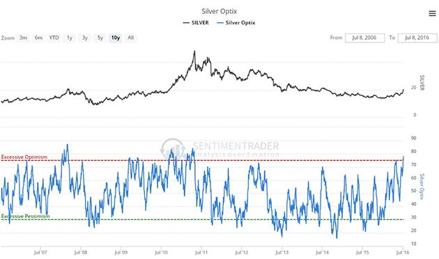 The silver optix or optimism chart shows that bullishness towards silver is now at extreme levels, and while this doesn't always lead to an immediate reversal, taken together with the other factors that we have observed, it does suggest that caution is in order with respect to silver's immediate prospects.