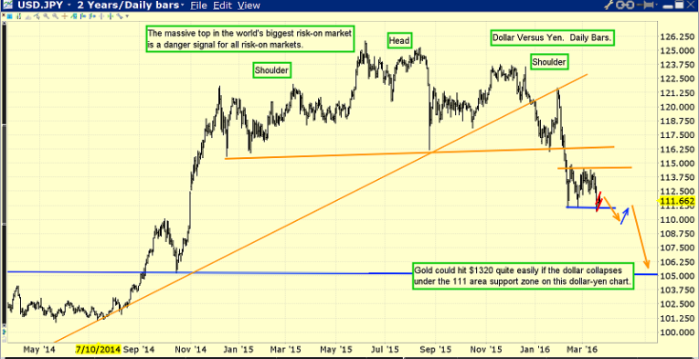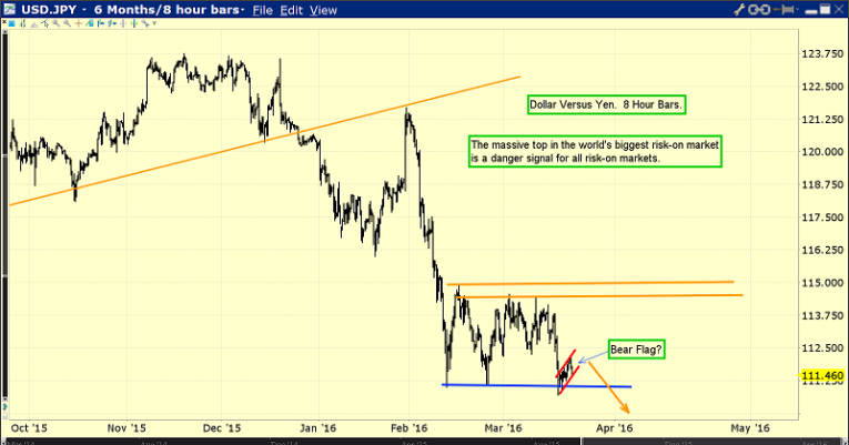 This eight hour bars chart of the dollar versus the yen has ominous implications for the dollar.