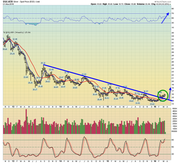 Major breakouts tend to have this kind of “textbook” technical set-up, with RSI on the weekly chart well below the overbought zone, and the Stochastics oscillator staging a “flatline” event in an overbought condition. Once the $18 target has been acquired, I think silver will pause, and then move towards $25.