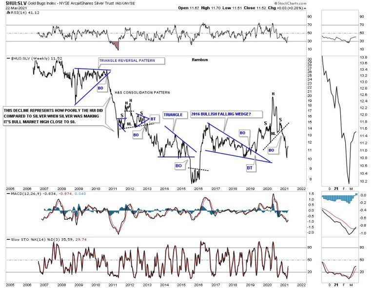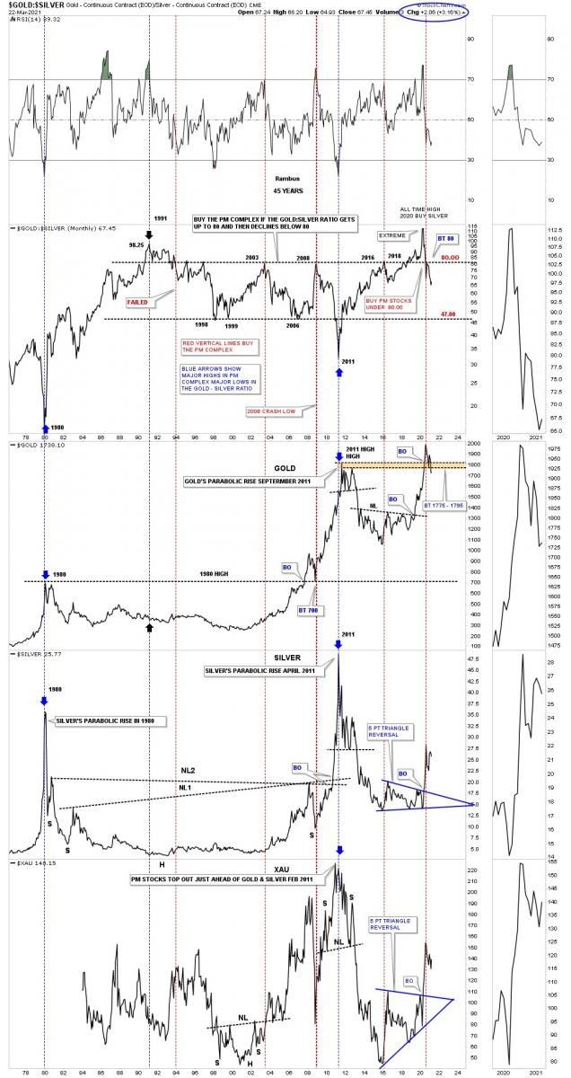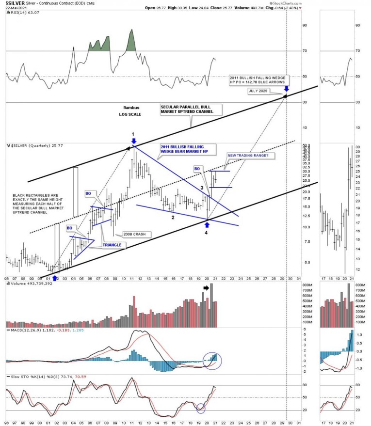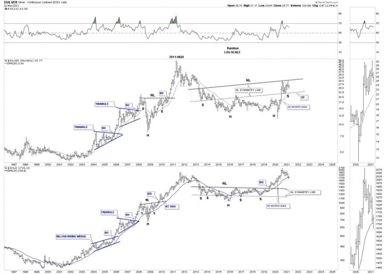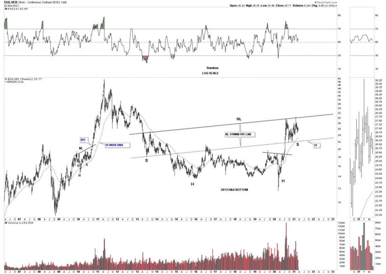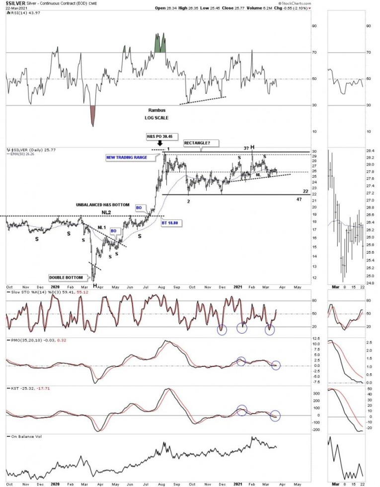 Before we look at the longer term charts lets look at a daily chart we’ve been following since the March 2020 crash low. Like just about everything in the PM complex and the stock markets as well the March 2020 crash produced many H&S bottoms and Silver was no different. Silver’s H&S bottom was a bit unorthodox in that it formed 2 unbalanced H&S bottoms. There was the smaller H&S bottom which was unbalanced with 2 right shoulder and one left shoulder. The bigger H&S bottom produced 2 left shoulder and one right shoulder. Even though it was unbalanced it didn’t affect the price objective which was up to the 34 area.