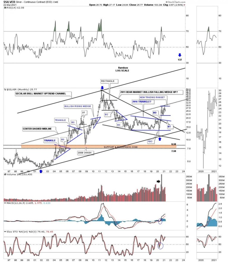 This next long term monthly chart we used during the bear markets year trying to figure out the bear market downtrend. There is always some morphing that takes place before you actually get the downtrend channel that is correct. The bear market could have ended at the last touch of the top trendline of the 2011 downtrend channel but Silver had one more trick up its sleeves, the March 2020 capitulation move that broke below the bottom rail of the 2016 triangle that ended up being a false breakout or a bear trap. As you can see Silver never actually closed below the bottom blue trendline which produced the V bottom. The Silver bulls finally came to life when they were able to take out the 2011 downtrend line and the top rail of the blue triangle in one strong move without as much of a backtest. That rally was hard and fast and Silver needed to consolidate its gains which is the blue rectangle that has been forming since the August 2020 high. There is nothing broken on this chart from a bullish perspective.