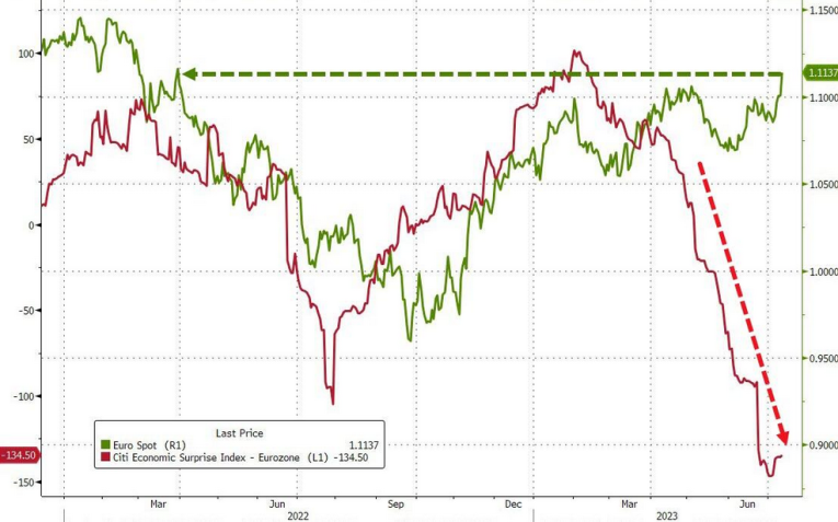 The green line above tracks the EUR/USD, while the red line above tracks Citigroup’s Eurozone Economic Surprise Index. For context, a positive ‘surprise’ occurs when a data point outperforms economists’ consensus estimate, while a negative surprise is the opposite. And if you analyze the right side of the chart, you can see that the red line has crashed, as Eurozone economic data has come in much weaker than expected.
