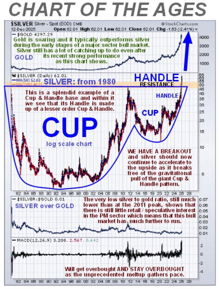 We are thinking big in this update on silver and I mean BIG. Although silver has been advancing for months now it’s only just over 2 weeks ago that it broke out of the giant holding pattern that it has been stuck in for about 45 years, the enormous Cup & Handle base that was described on the site several months ago. The technical implications of this development are MONUMENTAL - it means that the silver price is headed to levels that will seem unimaginable to most investors and here’s the thing – this scenario is fully backed up by the fundamentals – the extreme supply crunch for silver that is right now starting to impact is the result of a truly extraordinary confluence of factors – a multi-year supply deficit that is suddenly creating an acute shortage due to increasing demand for physical silver for industrial purposes for use in many modern applications against the background of silver being declared to be a “critical mineral”, coupled with a surge in investment demand as the current fiat money system flies apart, amplified by Central Banks now acquiring silver as a monetary metal. Making the situation even worse is that the multi-year supply deficit has literally been “papered over” by price suppression for many years on the paper markets with the lid being kept on it by unbacked and leveraged shorting on a vast scale. This has created a truly explosive situation that can be likened to a pressure cooker whose lid is about to blow off. So now we will revisit our CHART OF THE AGES that shows the enormous 45-year Cup & Handle pattern with the price up to date as of last Friday. The most important point to make regarding this chart is that this huge pattern can clearly support a massive bull market, whose minimum price objective is equal to the height of the Cup & Handle on this log chart. Such an advance puts the price somewhere in the hundreds. The 2nd most important point to make is that at the end of November, on the 28th to be exact, the price finally broke decisively out of this enormous pattern to commence a bull market that promises to be of epochal proportions and the final and related point is that, as we can easily see, despite silver looking like it has risen a lot on short-term charts, this new bull market has only just gotten started – it is still in its infancy.