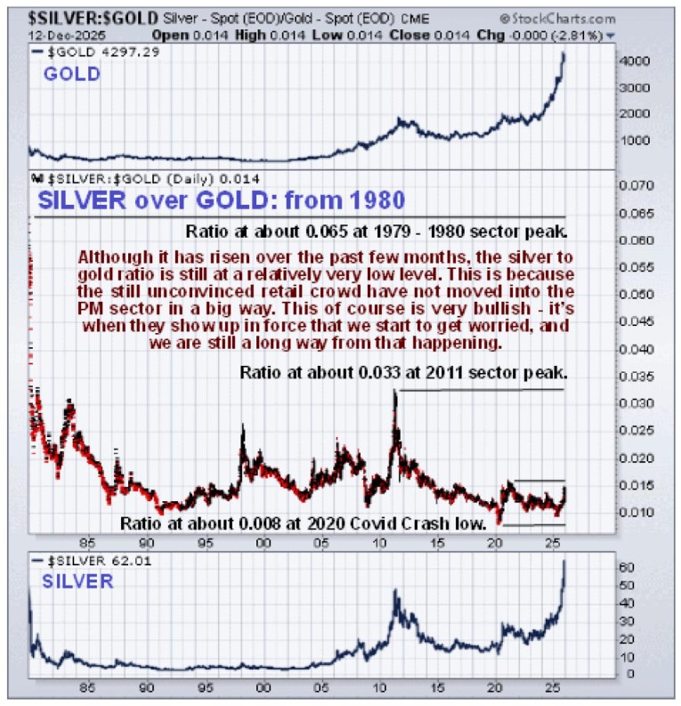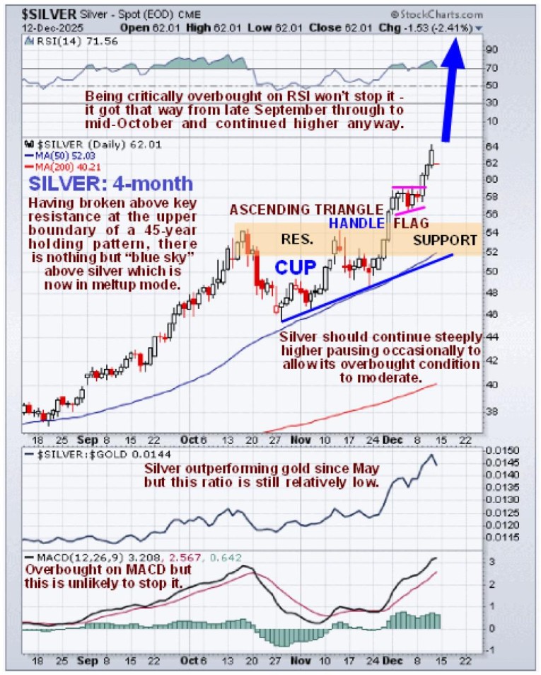 It’s worth reviewing recent action in detail on a 4-month chart. You may recall that we had thought that a corrective C-wave down to a point near to or below the late October low was likely. The setup is so strong that it didn’t happen, so we swiftly revised our thinking in light of developments and is now clear that the stunted C-wave that did occur which found support above the rising 50-day moving average and well above the late October low served to create the “Handle” of a small Cup & Handle continuation pattern with the entire consolidation pattern from the mid-October peak also being a bullish Ascending Triangle that led to the momentous breakout on 28th November, a day that should go down in the history books as one of the greatest days in the history of the silver market, if not the greatest day. Following the breakout a small bull Flag formed early this month which led to another upleg that has resulted in a very overbought condition. While it may take a little rest here, conditions are now perfect for a total meltup to occur in silver where it continues to advance steeply to higher and higher levels, overbought or not. In this environment silver stocks that have been “dragging their feet” lately, such as Aftermath Silver (AAG.V) and Couer Mining, CDE, should get their act together and take off strongly higher.