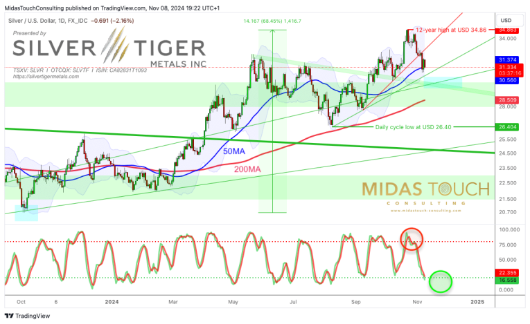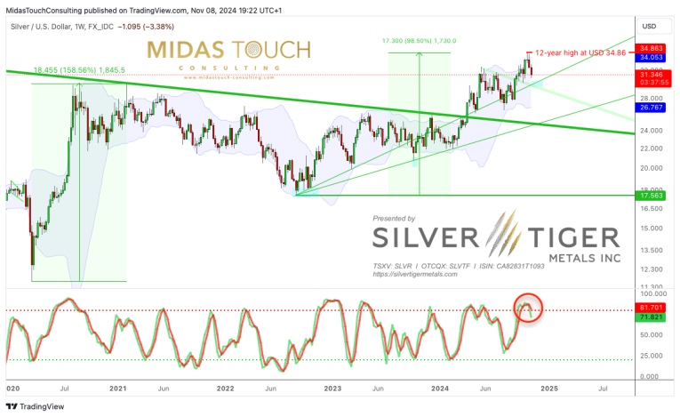 Since it’s last significant low and turning point at USD 26.40 on August 8th, 2024, silver rallied by more than 32% to a new 12-year high at USD 34.86 on October 23rd. Over the last two weeks, however, the silver market came under severe pressure and has sold off to USD 30.84 as of Wednesday. This sharp decrease particularly gained momentum following Donald Trump’s victory in the U.S. presidential election. We timely had anticipated a profit-taking event in the precious metal prices in our bi-weekly gold analysis as well as in our most recent weekly gold chartbookSilver Chartbook – Easing War Premium Leads to Healthy Pullback.
