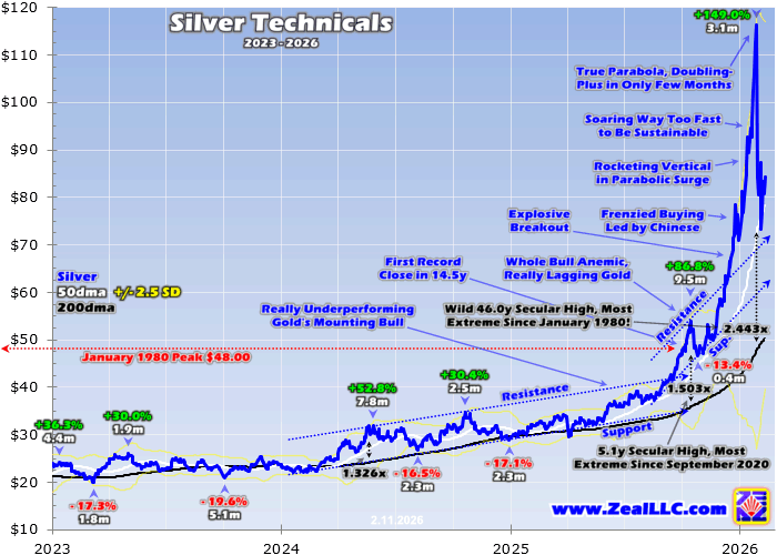 From late October to late January, silver skyrocketed a jaw-dropping 149.0% in just 3.1 months!  That astounding run included 23 new all-time-record closes, achieved on nearly 3/8ths of its trading days.  My quarter-century-plus of historical market studies have led me to define parabolas as doublings within two-to-three months following massive bull runs.  Silver certainly fit that bill by mid-January, its extremes were crazy.
