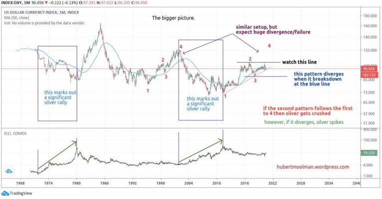 If the second pattern continues to follow the first, then the US Dollar index will rally significantly over the coming months and years. If this happens, silver prices would likely be crushed.